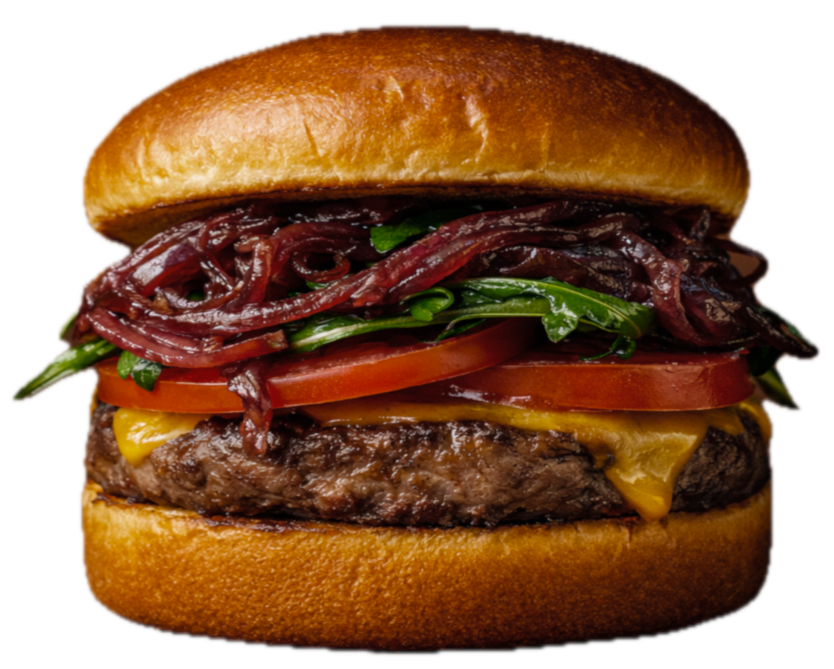 Einzigartiger Burger aus hausgemachtem Rinderhackfleisch im Brioche Bun mit geschmolzenem Cheddarkäse, karamellisierten Zwiebeln, frischem Rucola und Tomaten, mit feiner Pesto-Mayo-Sauce